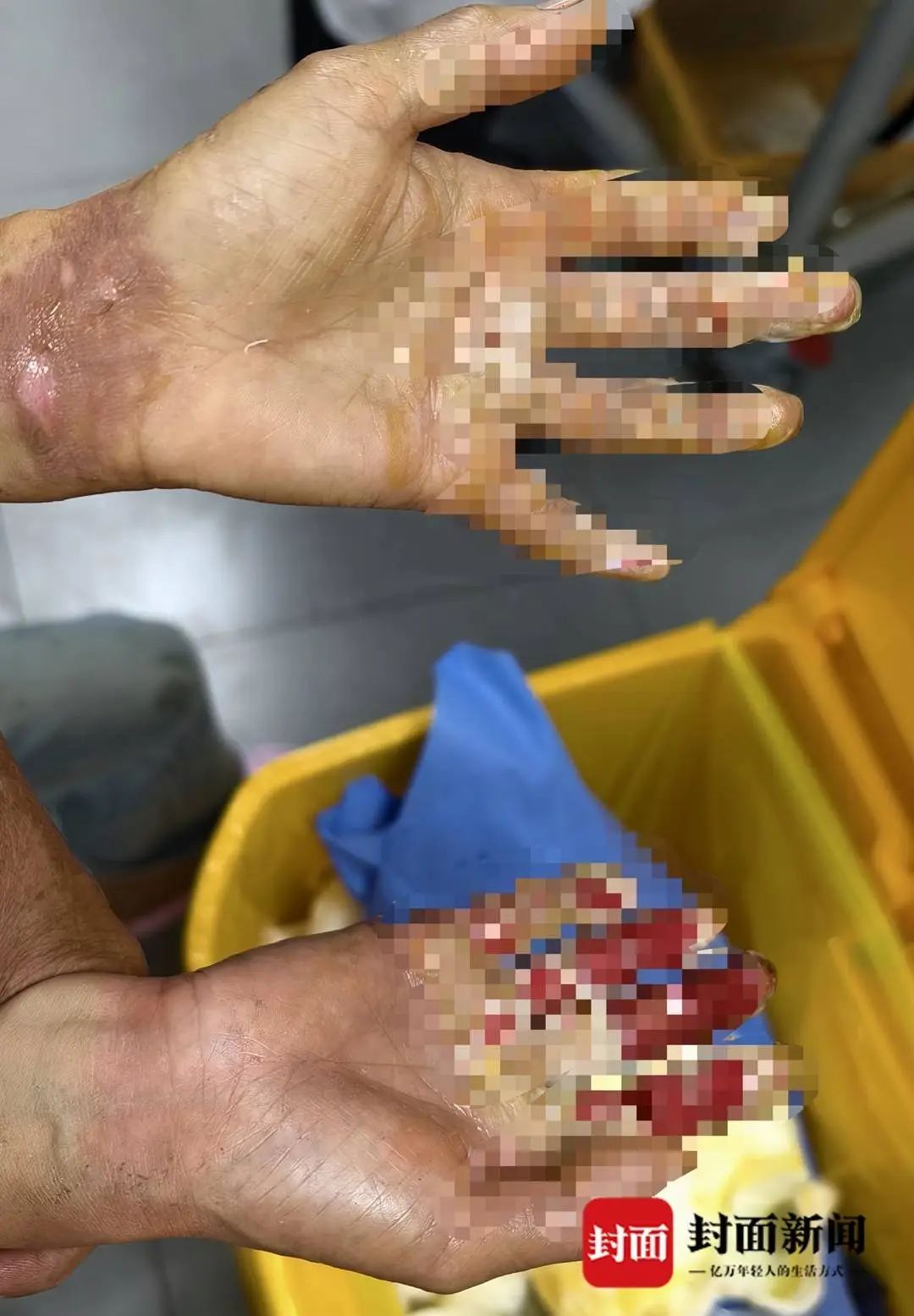 “就几秒钟的时间,我们这边马上给孩子冲凉水,他身上的皮肤就已经有了变化。”一段现场视频显示,事发后,现场人员将钟宇放在塑料筐中降温,其手臂、大腿等多处皮肤表面,明显出现了有色差的部分。刘萍的双手,也被不同程度烧伤。