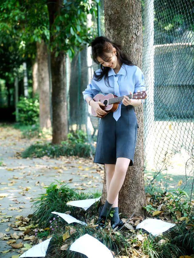 最后,写真背景选取校园的角落。在这样的场景下,她身旁的小提琴与相机,进一步烘托出她的文艺气质。