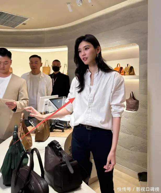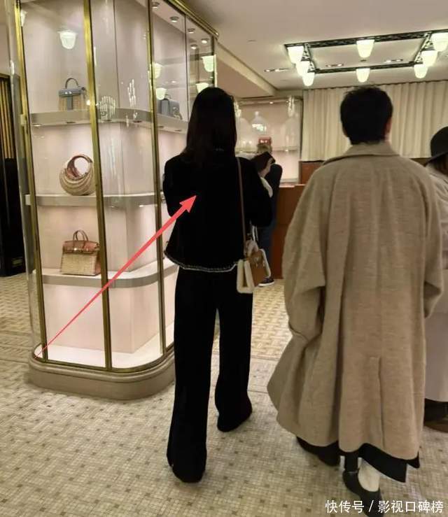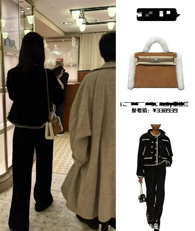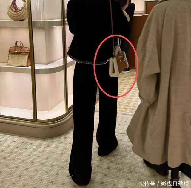 奚梦瑶拿着一件白色毛茸茸外套,很专心的看着店里货架上的包包。仔细看,奚梦瑶背着一个棕色有白色毛茸茸边的爱马仕包包,体积不算大,与她的穿搭很般配。一身的打扮很有名媛范,贵气逼人。